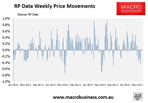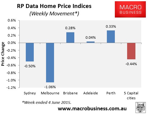 In the week ended 4 June 2015, the Core Logic-RP Data 5-city daily dwelling price index, which covers the five major capital city markets, fell by 0.44% – the fourth consecutive weekly decline, which typically happens this time of year (see next chart).