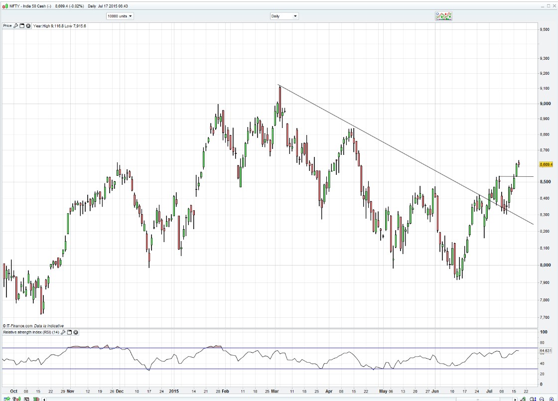 Sure, we have seen weakness in most emerging market currencies this week, but that is a function of traders increasing their exposure in general to the USD and there has been no real panic in the selling. On the equity side, I’m even seeing a compelling opportunity to be long the Nifty 50 (India), where price action looks really bullish on the daily chart and having broken through the June highs is eyeing a move into the 8,800 (currently 8,610).
