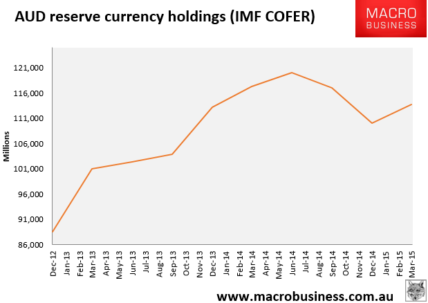 The IMF released its COFER data Friday night and it contained a surprise forAustralian dollar bears. Total foreign holdings of the battler rose in the March 2015 quarter to $113,834 million, up 4.1% in a quarter:
