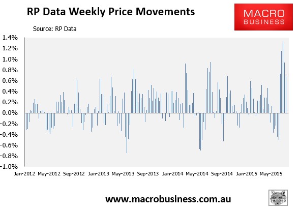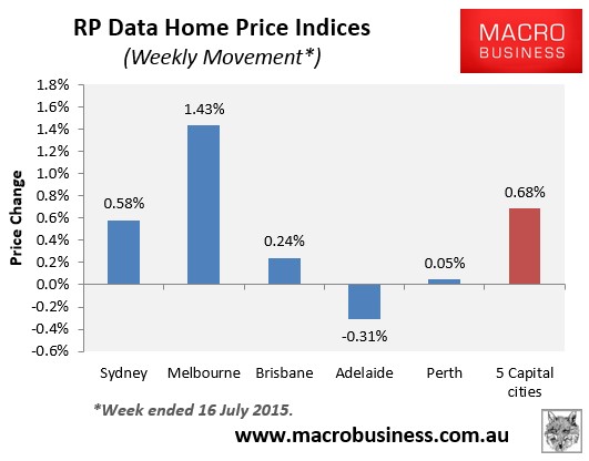 In the week ended 16 July 2015, the Core Logic-RP Data 5-city daily dwelling price index, which covers the five major capital city markets, jumped another 0.68% – the fourth consecutive week of strong rises (see next chart).