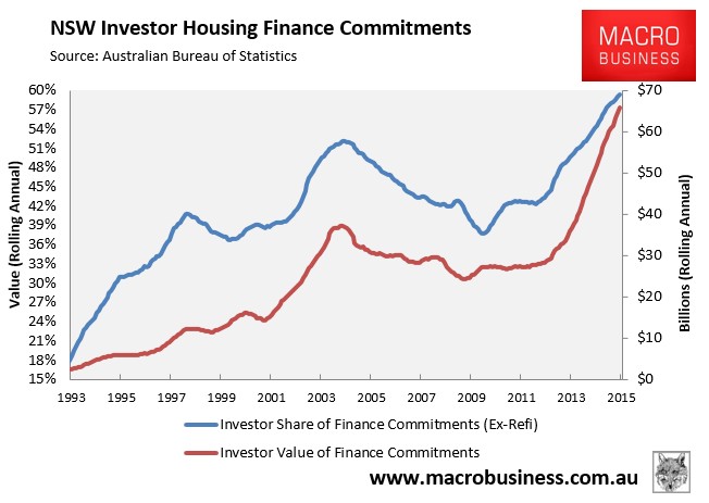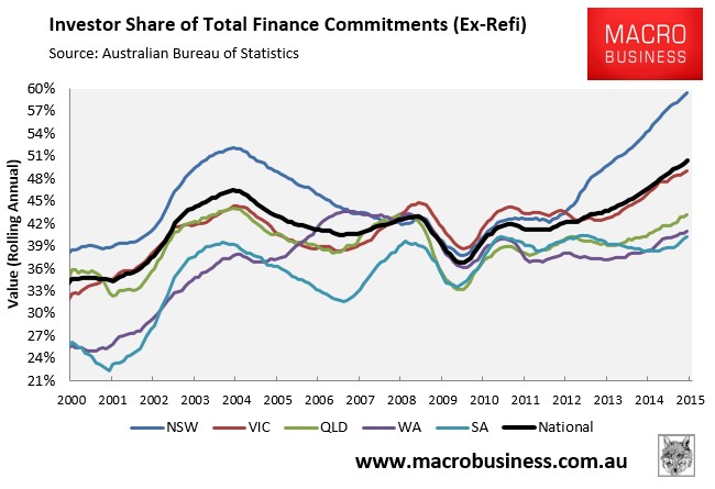 As at May 2015, investors accounted for an astonishing 59.4% of total housing finance commitments (excluding refinancings) in New South Wales (Sydney) – a new record. Victoria’s (read Melbourne’s) share of investor mortgages also hit a record high 49.1% in May: