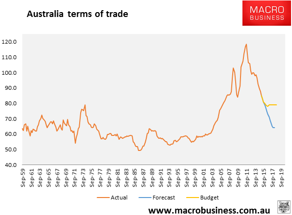 Surely you jest, you say! But no, I am not playing. Australia’s terms of trade are on the verge of another major crash downwards. It is now next to certain that iron ore will be deep in the $30 before year end and that will wipe out major miner profits, wipe out Budget forward estimates before the MYEFO, and deepen as well as extend the national income recession. Here’s the forecast: