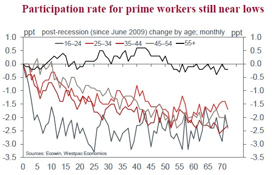 The apparent tension between seemingly full employment and relatively soft nominal wage gains is resolved when one considers the other major measure of slack: the employment-to-population ratio. Having been brought to historic lows not only by the job losses of the post-GFC recession but also by the sharp decline in participation to end-2013, it has only edged higher since. This result implies there remains a large pool of marginally-attached workers which could be brought back into the labour market, if conditions were favourable. That many of these could-be workers are in primeworking age groups highlights both their availability and potential productive use by the economy.