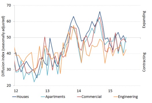 As shown below, dwelling construction (particularly apartments) continues to expand, but is being more than offset by falling engineering and commercial construction: