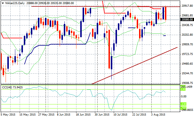 Recapping Asia’s session, the Shanghai Composite had a scratch day to follow the near 5% rise on Monday and remains just below 4000 points. The Hang Seng also barely moved but other peripheral markets were badly shook up by the Yuan devaluation event including the Nikkei 225 which took back all the gains of Monday to finish at 20720 points. Futures are pointing to a lower open this morning on a poor lead from Wall Street as the bourse rejects the high at 20800 points:
