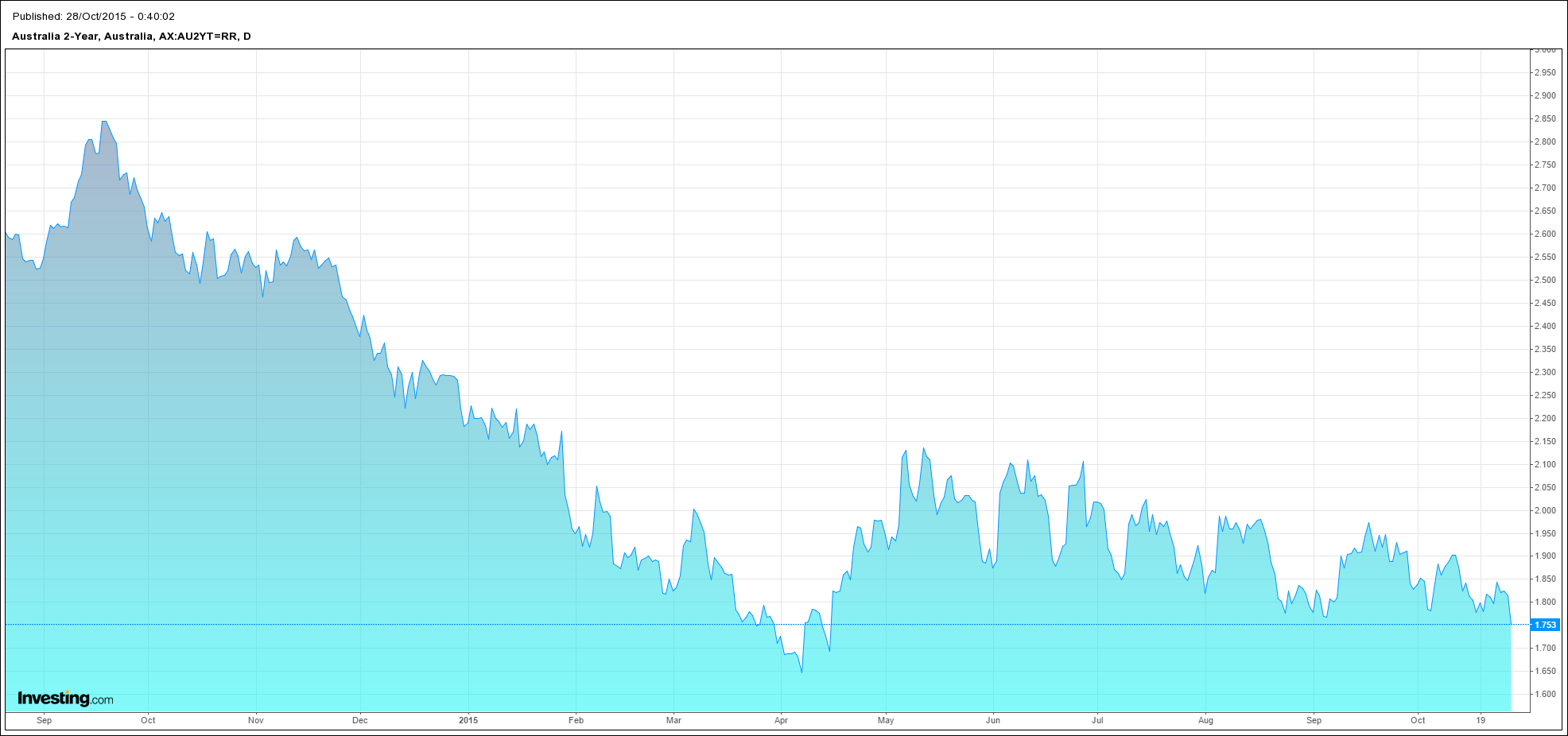 The two year bond just roared on the weak CPI breaking out of its recent trading range and fully pricing the next rate cut at 1.75%: