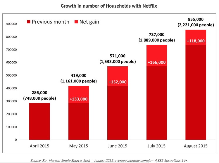 The entry of online streaming services like Netflix, Presto and Stan in March this year has been hugely successful, with recent research by Roy Morgan suggesting that by August, market leader Netflix alone occupied over 850,000 Australian households, and reached some 2.2 million viewers (see next chart).