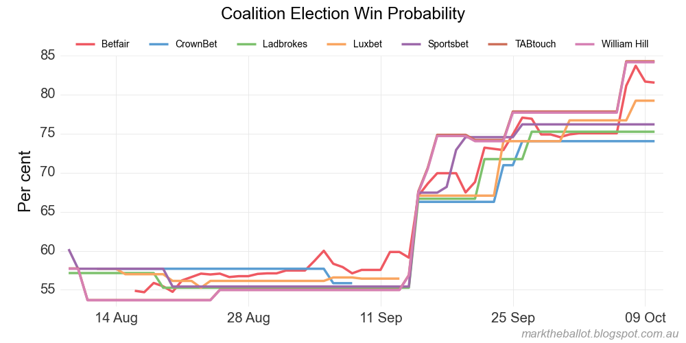 House Coalition Odds ($) Labor Odds ($) Coalition Win Probability (%) 2015-10-10 Betfair 1.15 5.08 81.540931 2015-10-10 CrownBet 1.28 3.65 74.036511 2015-10-10 Ladbrokes 1.25 3.80 75.247525 2015-10-10 Luxbet 1.18 4.50 79.225352 2015-10-10 Sportsbet 1.25 4.00 76.190476 2015-10-10 TABtouch 1.12 6.00 84.269663 2015-10-10 William Hill 1.13 6.00 84.151473
