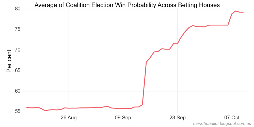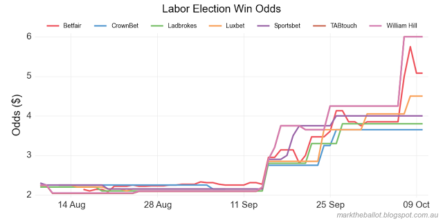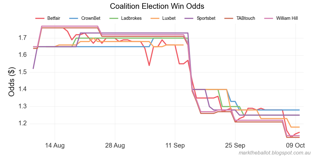 Betting markets have the Coalition even more un-backable. From Mark the Ballot: