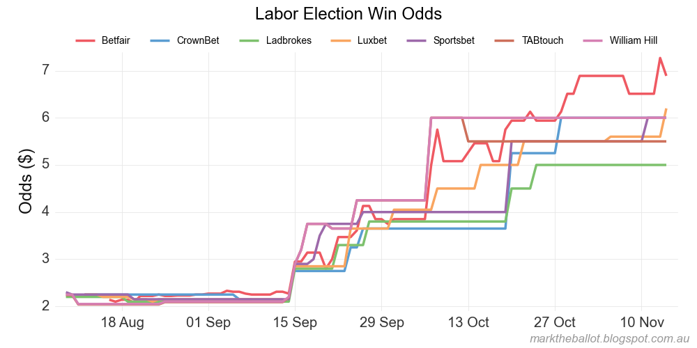 If it is the case that a sense of political legitimacy is returning via Malcolm Turnbull then it is very bad news for Bill “Kingslayer” Shorten, who was perhaps the key player in the entire revolving door prime ministership debacle. Certainly betting markets are writing him off, from Mark the Ballot: