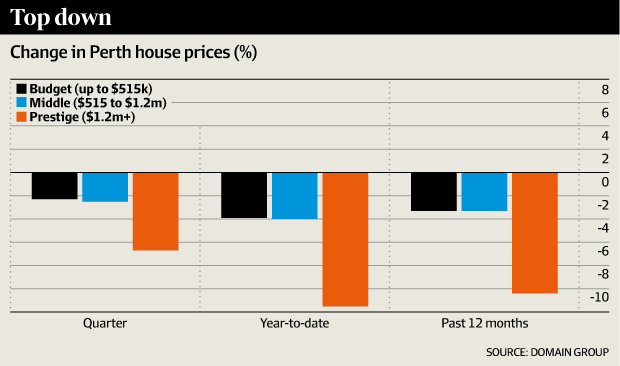 Data compiled by Fairfax’s Domain Group shows prestige home prices, or homes worth more than $1.2 million, fell 6.7 per cent in the September quarter, extending the decline this year to 11.5 per cent.