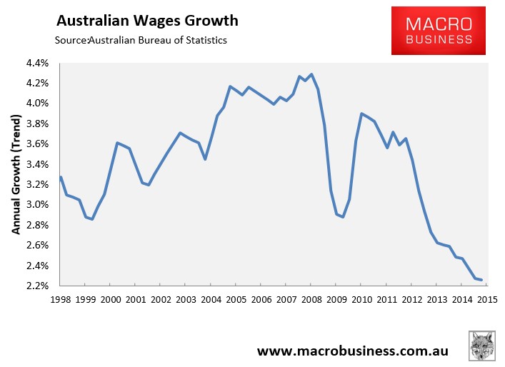 Yesterday’s wage price data, released by the ABS, revealed that annual wages growth fell to the slowest pace on record (1997) in the September quarter, clocking it at only 2.26% (seasonally-adjusted and trend) over the year: