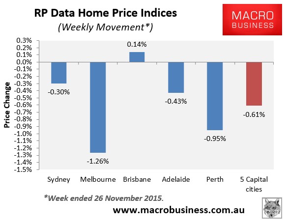In the week ended 26 November 2015, the Core Logic-RP Data 5-city daily dwelling price index, which covers the five major capital city markets, fell by 0.61% – the sixth consecutive weekly fall (see next chart).