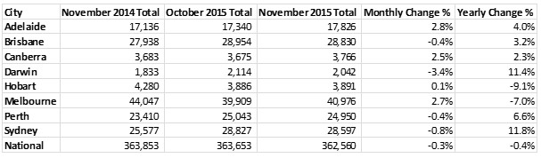 As shown above, for sale listings in the month of November fell across four markets and rose across four.