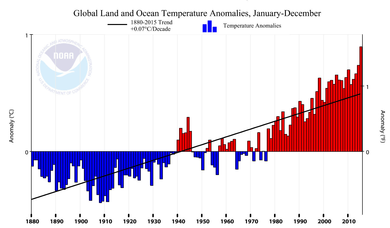 This marks the fourth time in the 21st century a new record high annual temperature has been set (along with 2005, 2010, and 2014) and also marks the 39th consecutive year (since 1977) that the annual temperature has been above the 20th century average. To date, including 2015, 15 of the 16 warmest years on record have occurred during the 21st century. 1998 is currently tied with 2009 as the sixth warmest year on record.
