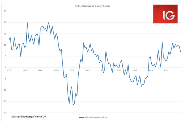 - Market pricing for a rate cut by the RBA has stepped up dramatically in 2016, with the market giving a 65% probability that we will see a rate cut by June. There was a worrying drop off in the NAB Business Conditions index for December (prior to the January selloff), which declined to its lowest level since April. Housing-related components were the biggest culprits for the weakness, which is consistent with the massive decline in HIA new home sales in November.