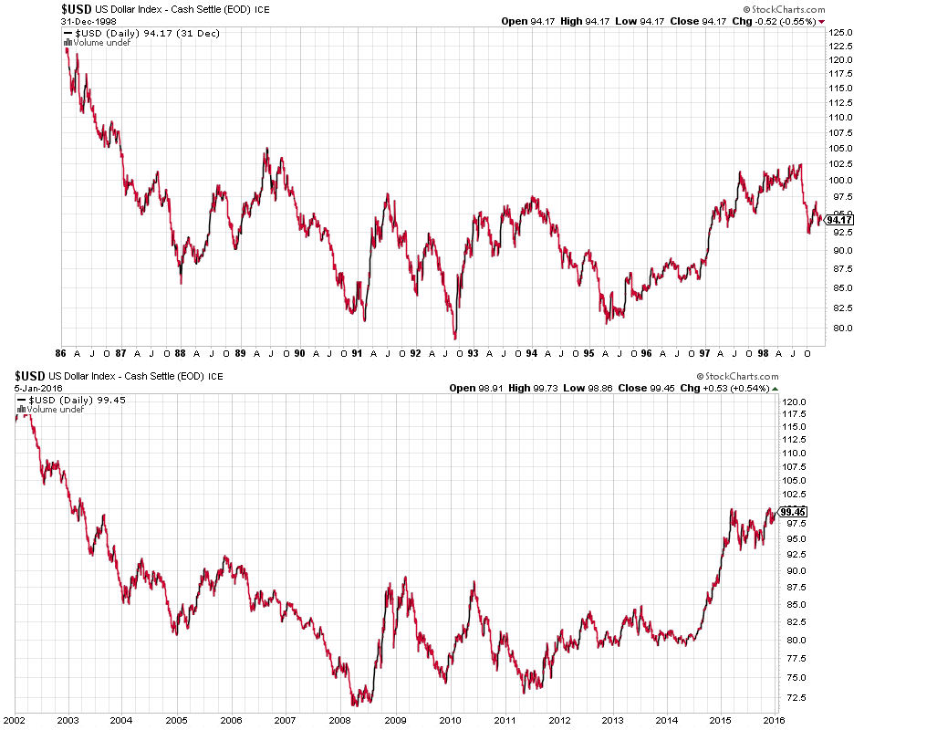 The official forecast here is still that the U.S. dollar system dies by deflation. Fiat currency burns from the periphery to the core. The fire rises in 2016 and the transition to a new financial order will take many years to play out. If the old U.S. dollar cycles hold and this dollar bull tops out in 2017-2019, it could take until the mid-2020s before the U.S. dollar breaks its lows set in 2008. The strains will be visible much earlier, but a crisis in the U.S. dollar itself may not unfold until then.