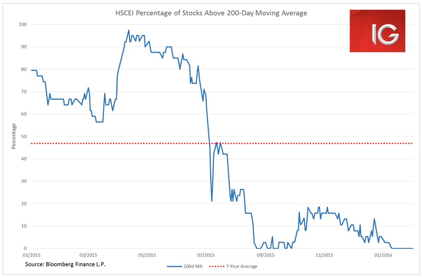 Hong Kong stocks were in full capitulation today, with both the H-share and Hang Seng indices losing roughly 3%. The H-share index was trading at its lowest levels since 2009, and when one looks at the market internals the true evaporation of sentiment on the index becomes clear. Exactly zero stocks have traded above their 200-day moving average since 8 January – the market internals are flatlining.