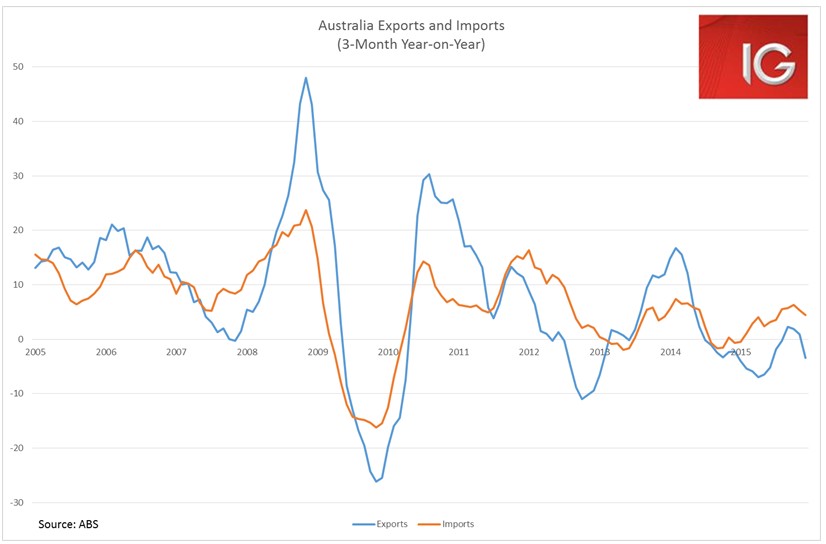 The Aussie dollar took another hit today with the dramatic deterioration in the December trade data. Given the 10.8% YoY increase in Chinese iron import volumes in December, one would have expected slightly better Australian trade numbers, although inflated trade numbers due to hidden FX flows seem to be an increasing concern in the Chinese trade data. The fact that Australia’s export price index declined a further 10.3% in the fourth quarter did not help the trade data in value terms. Even then, the dramatic 32.5% YoY decline seen in Australia’s iron ore exports was the worst seen since May. It now looks like the important net exports contribution to Q4 Australian GDP will be much weaker than Q3. If this trend continues, Australian activity data looks set to deteriorate at a rapid pace in 1H 2016. There is plenty more downside to the AUD from its current US$0.70 level.
