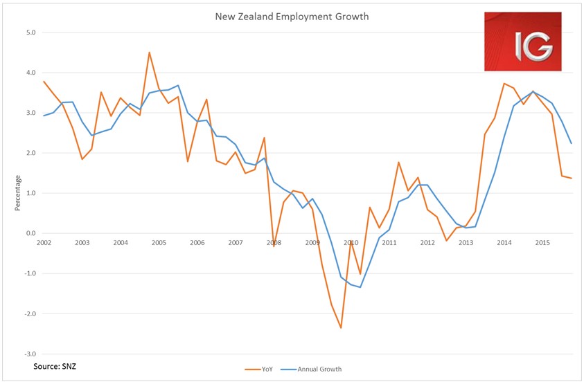 The Kiwi dollar had a boost today after Q4 employment growth came in much stronger than expected, and to further solidify its gains, RBNZ governor Graeme Wheeler took a far more hawkish tone in his speech today than was evident in the most recent RBNZ statement. The New Zealand unemployment rate fell to its lowest level since Q1 2009 but the vagaries of quarterly data do seem to be hiding far weaker numbers. For one, Statistics NZ noted that a large amount of the workforce retired, improving the unemployment rate substantially, and the vast bulk of new jobs in the quarter were volatile part-time jobs (+2.5% QoQ).