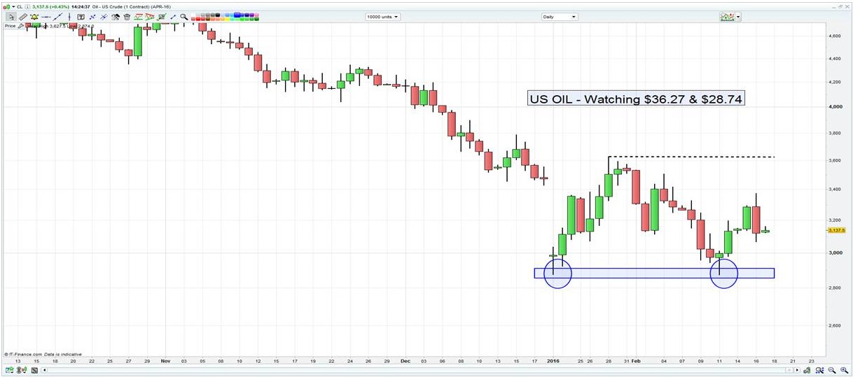 Clearly defined trading levels can be found in so many asset classes and it is thematic of a market that has paused for thought and is assessing the landscape after thinking, ‘perhaps things aren’t so bad’. One such market is US crude where price action look remarkably like that of the S&P 500, minus the 9% correction seen yesterday. On the daily chart, a clearly defined double bottom pattern is in play and it may take some real meat on the bone for the neckline (or 28 January high) of the pattern to be broken. The preference is to trade a range in the April contract (now front month) of $36.27 to $28.74, but a break of this range would be a huge development. Yesterday’s news of an ‘agreement’ between Russia, Saudi Arabia, Qatar and Venezuela is certainly positive and a small step in the right direction, but it’s not going to cut the mustard for those who have increased long positions in the hopes of more concrete measures. Still, while it highlights the strains on the producing nations’ economies, it does show intent which breeds hope.
