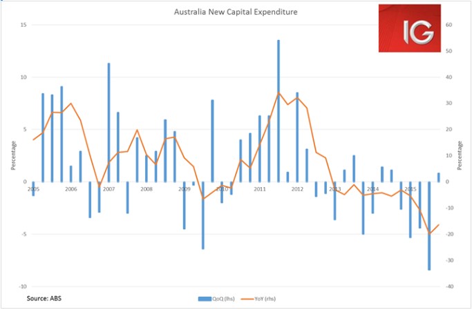 True to form, the Aussie began to weaken ahead of the Capex release and then promptly dropped another 0.3% as the forecast Capex numbers for 2016-2017 came in well below forecasts (AUD $82.6 billion against estimates of AUD $92.8 billion).