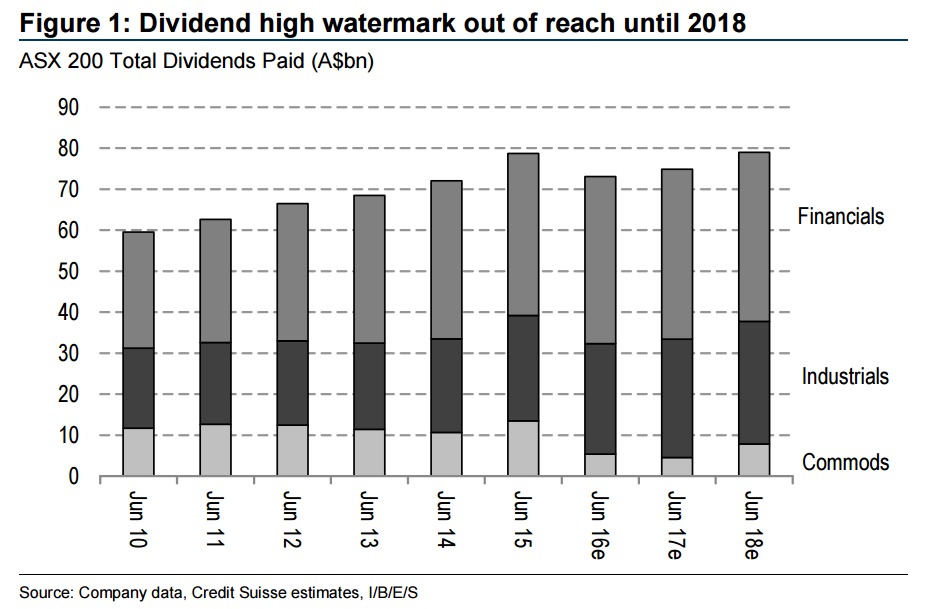 ■ Scrapping the progressive dividend: Australia Inc.’s progressive dividend policy is being scrapped. Analysts are forecasting $A73bn of dividends to be paid in FY16. There was A$79b of dividends paid in FY15. Commodity companies account for the all of the expected decline in ASX 200 dividends.