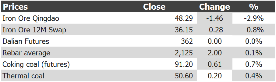 Tianjin spot down 0.4% at $US49. Paper flamed out. Rebar firm. Port stocks up a marginal 200k tonnes. Texture from Reuters: