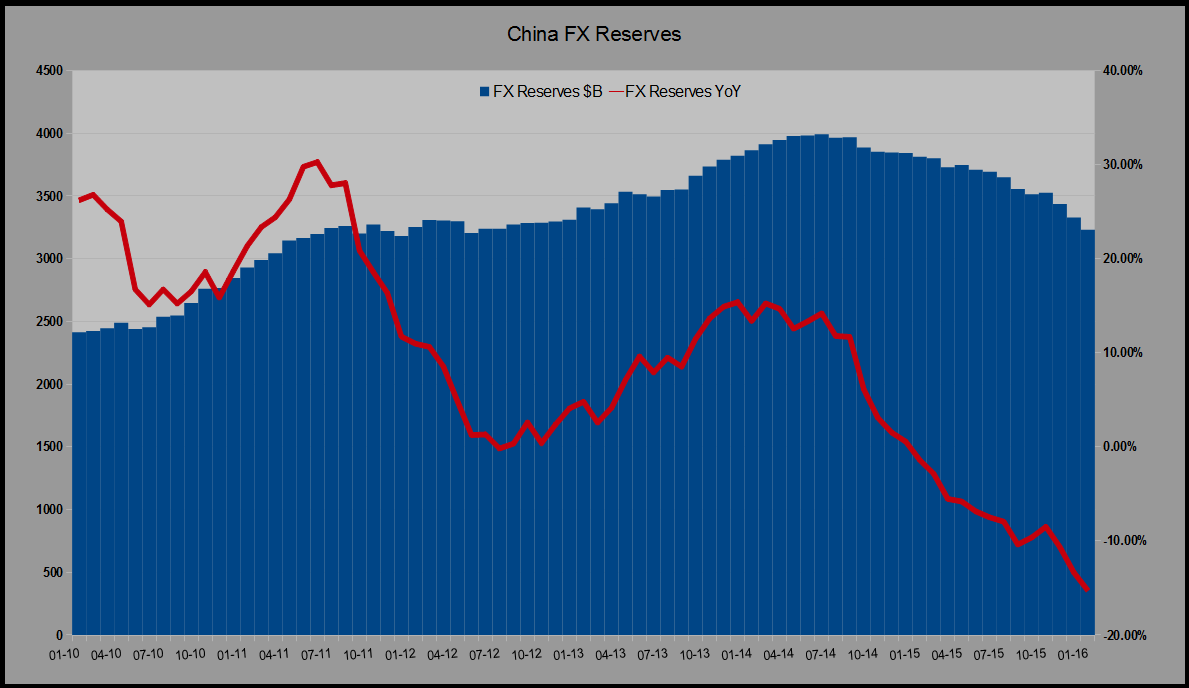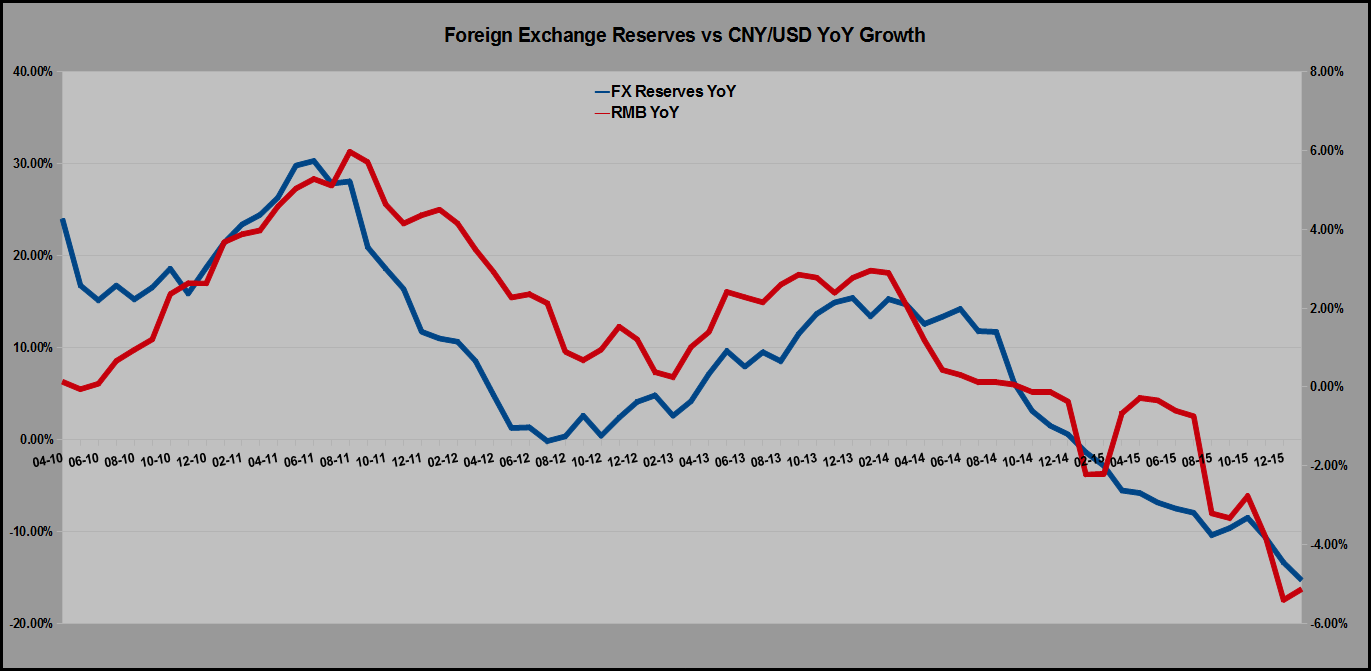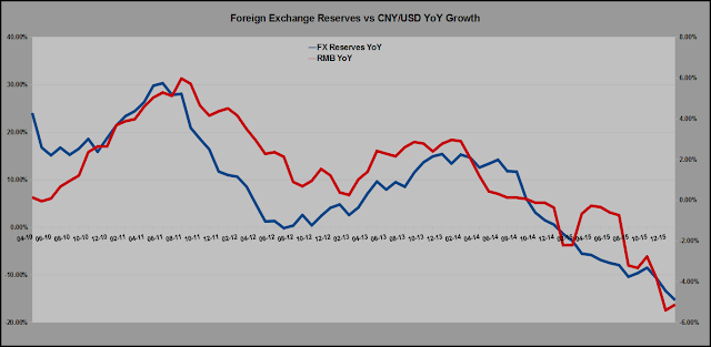 The longer China props up the yuan, the faster and larger will be the decline. For every $1 in reserves, there was almost 42 RMB in M2 in January. At present exchange rates, 16% of M2 speaks for 100% of reserves. Not a crisis in and of itself, but a problem due to the pace of outflows. At the present pace of reserve and renminbi decline, that percentage will be down to 11% in October, with the renminbi likely down to 7.4 USDCNY or lower. The renminbi would be in a worse position in October, with an even larger expected depreciation than predicted today.