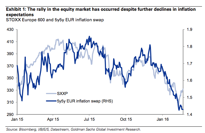 The rally in the equity market has occurred despite further declines in inflation expectations (and bond yields). In Europe 5 year-5 year forward inflation swaps (which Mr. Draghi has emphasized in the past) have recently hit an all-time low.