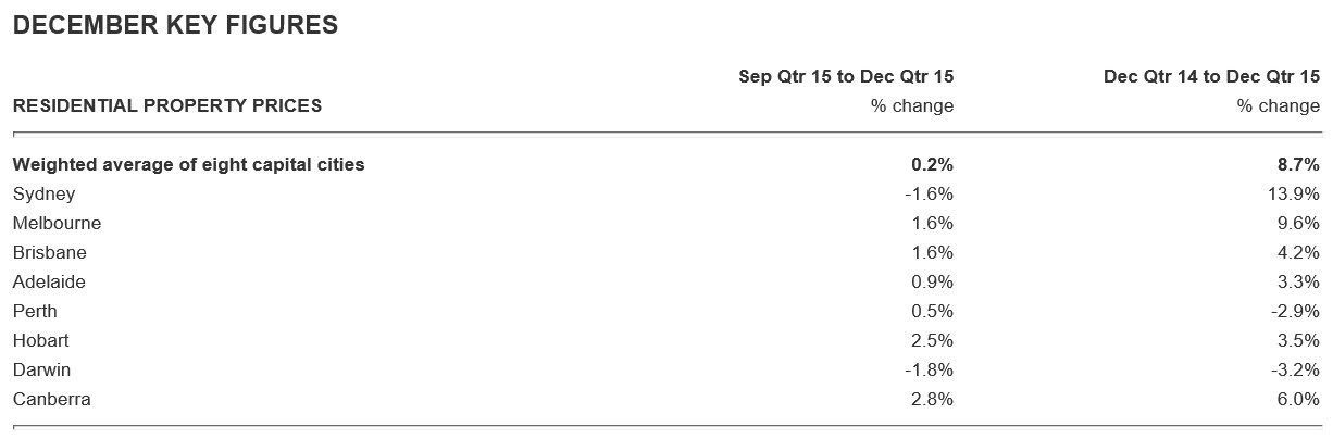 The ABS has today released its property price index – incorporating both detached houses and units – which registered a 0.2% rise in home values nationally over the December quarter and an 8.7% gain over the year, a deceleration from the 10.7% annual growth recorded in the year to September 2015.
