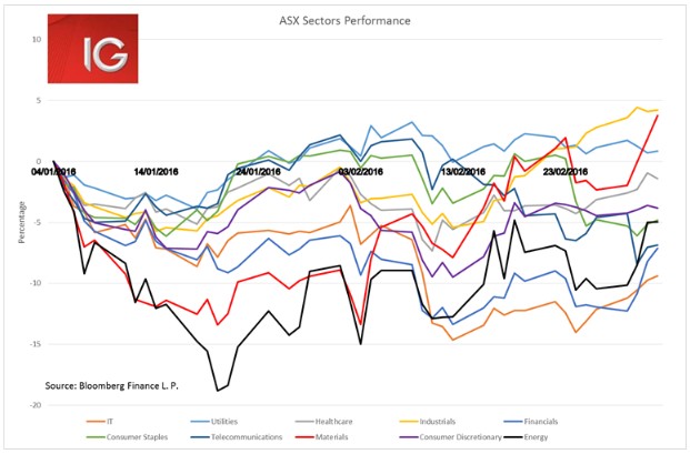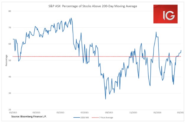 Market breadth measures, such as the percentage of companies above their 200-day moving average, are showing this rally is looking far more stable than that of late-January. 56% of companies are trading above their 200 DMA, however, the ASX has not sustained 60% of companies above their 200 DMA for more than a few days since May 2015. As the ASX moves above 5100 investors may well look to start fading the rally, particularly given it has been driven so much by the down-beaten commodities space.