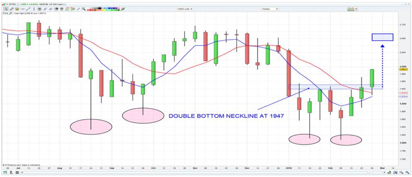 The purest reaction to the payrolls will be seen in 2- and 5-year US treasuries and fed fund futures and from there we should get a read into credit, the USD and then subsequently equities and commodities. Focusing on the S&P 500 (see chart below), the index looks set to close the week above the neckline of the January and February double bottom at 1947 and the technical target here would be 2080. Naturally 2080 is not going to be seen overnight, although it is only a further 4.3% away.
