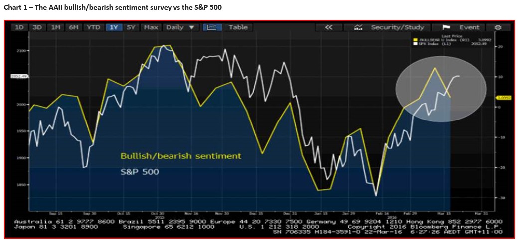 One has to question though what will be the catalyst for a collapse in risk sentiment though, and other than political issues there doesn’t seem a lot to really promote strong downside. Consolidation seems likely. If we look at investor sentiment (I’ve looked at the ratio of AAII bullish/AAII bearish sentiment – the yellow line on chart one), we can see bearish sentiment is accelerating. This is not a reason in itself to short the S&P 500, but it does suggest a number of market participants are seeing the upside harder to come by. I would echo this view.
