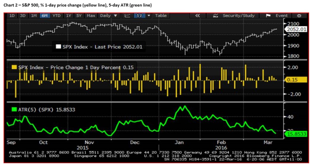 Interestingly, 92% of S&P 500 companies are above their 50-day moving average. On one hand this shows great participation in the rally, but this is also a level where the contrarian in me says ‘sell euphoria’. The fact that the five-day average range (ATR) is a meagre 15 points (chart 2 – the green lower pane) and the Dow Jones 145 points is concerning, especially when put into context that the VIX (US volatility index) has fallen for eight of the last nine sessions. The fact that many market internals are so elevated while implied volatility is at such low levels makes me uneasy.