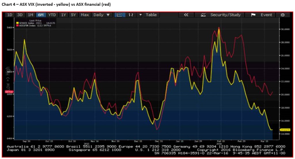 The ASX volatility index is at the lowest level since July and at 14.6 is now at a 24% discount to the 12-month average. This low level of implied volatility in the equity market has been positive for domestic yield plays, with the ASX financial sector a key beneficiary. Here I have flipped the financial sector around to better show the correlation between low volatility and the hunt for yield.