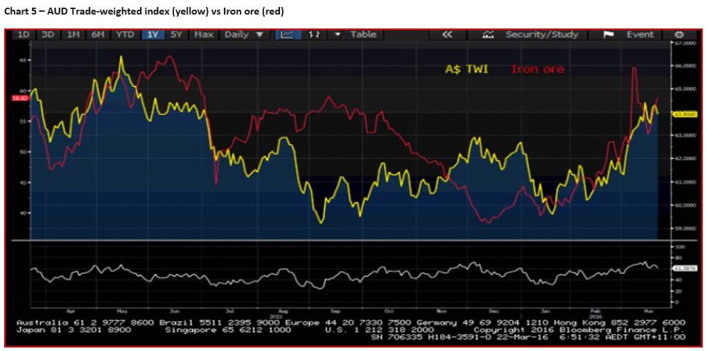 Another key beneficiary has been the AUD, although the rise in iron ore, steel and energy has also been a key tailwind. All eyes are on Glenn Steven’s who has the opportunity to somewhat talk down the AUD at 16:15 AEDT, although he would be facing the wrath of the US treasury again, especially as the trade-weighted AUD has benefited from rising terms of trade (see chart 5).
