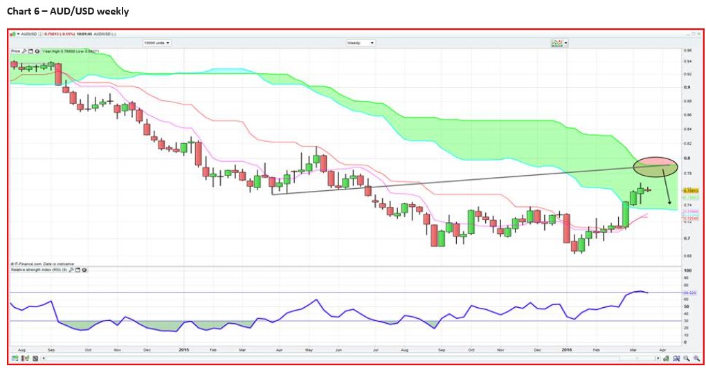 The AUD/USD is in similar position as the S&P 500, and is in need of a new catalyst (in either direction). A number of the daily momentum indicators are starting to roll over and I suspect downside will be driven by the S&P 500. (Dalian) iron ore futures are 1.1% lower today and the PBoC ‘fixed’ the CNY 147 weaker today and both are strong headwinds, although we haven’t seen much in the way of AUD selling. My conviction to short AUD/USD is best seen on the weekly chart, where we have a confluence of strong resistance levels into $0.7800 to $0.7850 and rallies over the next week or two should be sold here in my opinion.