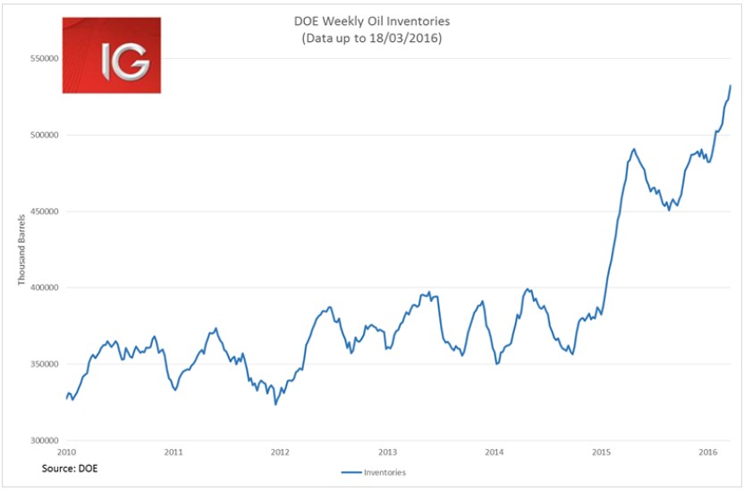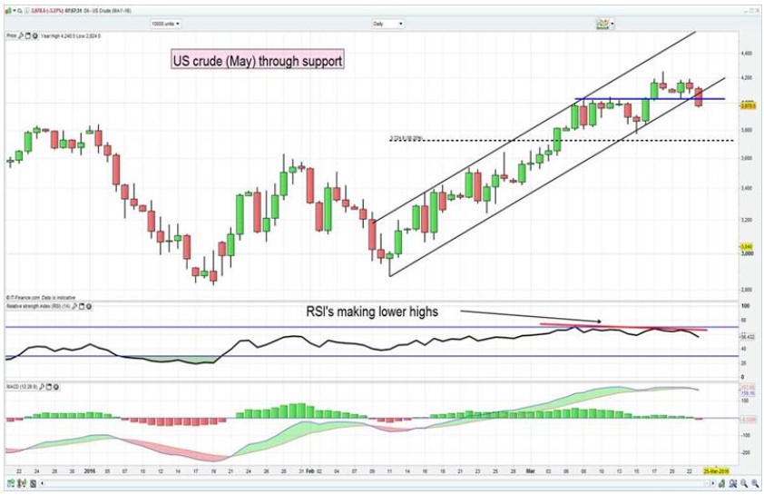 The oil price and equity markets are teetering on the verge of a much larger pullback as hawkish Fed officials have lifted the US dollar this week. Markets in Asia look to be rolling over as the whole region suffered steady losses throughout the session. Chinese Premier Li Keqiang’s upbeat speech at the Bo’ao Forum did little to soothe investor concerns as the Shanghai Composite had its worst day in two weeks. Overnight, the US weekly Department of Energy numbers saw a significant addition to already heavily oversupplied oil inventories. 9.4 million barrels were added to crude inventories, the biggest weekly addition since February, making another concerning data point for oil after last week’s Baker Hughes crude oil drill rig count increased for the first time in three months.