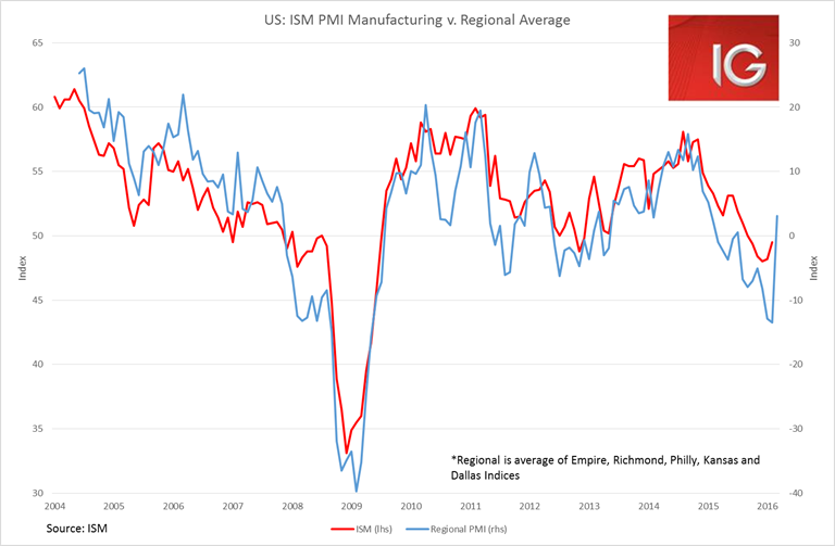 A weaker US dollar has really been driving the recovery in US manufacturing. All major US regional manufacturing indicators are pointing to a major recovery in Friday’s ISM manufacturing number. It is likely to move above 50 for the first time since September last year. This in turn is likely to see further benefits in US job growth going forward.