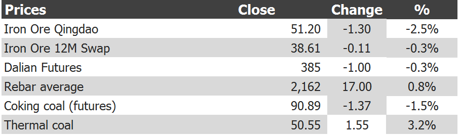 Spot firmed with Tianjin benchmark up 0.2% to $51.70. Paper fell (though Dalian recovered overnight). Rebar jumped again but there are reports that price rises are already outstripping the market. The rally is stalling around the $50 point of control.