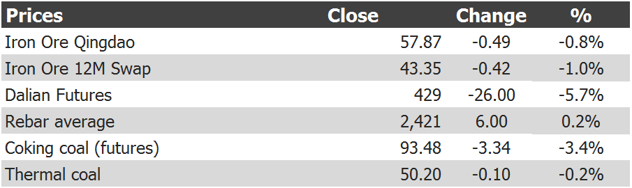 Spot down with Tianjin benchmark off 1% to $57.30. Paper hammered. Rebar holding but not for long.