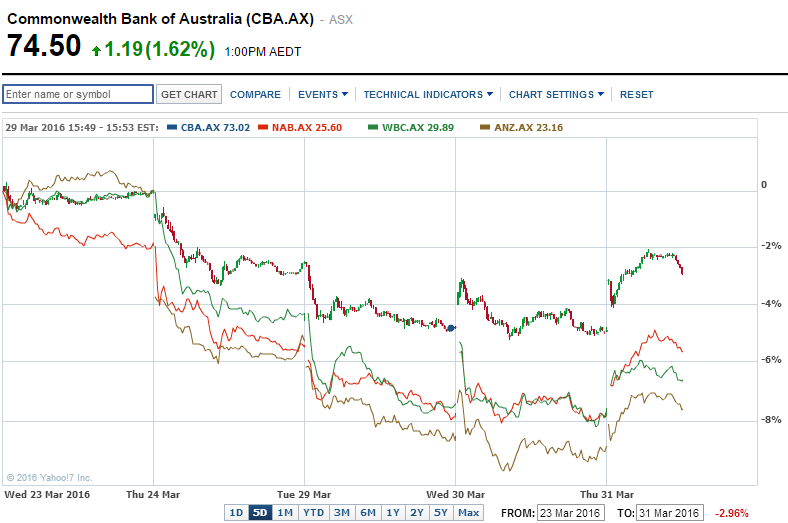 The banks are up over 1%, but this barely takes back the post Easter weekend slump as the 5 day chart shows: