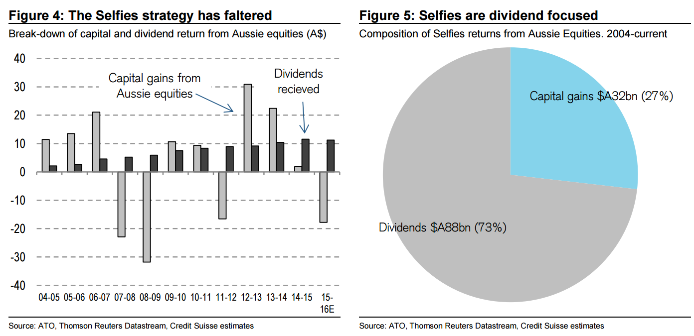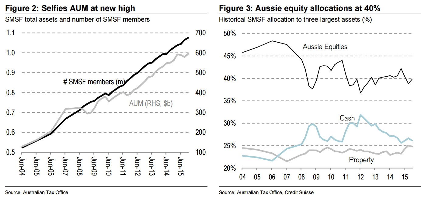 There are 1.08m SMSF members (Selfies) in Australia that manage 552k funds according to the Australian Tax office as of the end of December 2015. Selfies control AUM of $595bn which is a new high and is equivalent to 29% of Australian Superannuation assets. They held $562bn (29%) as of December 2014. Figure 2: Selfies AUM at new high Figure 3: Aussie equity allocations at 40% SMSF total assets and number of SMSF members Historical SMSF allocation to three largest assets (%) Source: Australian Tax Office Source: Australian Tax Office, Credit Suisse Selfies remain concentrated in three assets—Australian equities, Australian cash and Australian property. Aussie equities make up 39% (A$237bn) of Selfies current portfolio. We estimate Selfies own around 17% of the Aussie equity market. The equity allocation recently peaked, when the market peaked, in the March-15 quarter at more than 42%. The second biggest asset Selfies hold is Aussie cash, 26% of AUM (A$155bn). The cash allocation has been trending lower over the last few years but has not crossed below 25%. The last time Selfies held less than a quarter of their assets in cash was before the global financial crisis. It is clear that Selfies didn’t hold enough cash going into the financial crisis, but they could be holding too much after the brutal event. Finally, Selfies hold 25% of their AUM in Australian property (A$147bn). The property allocation has changed little for much of the last 10 years.