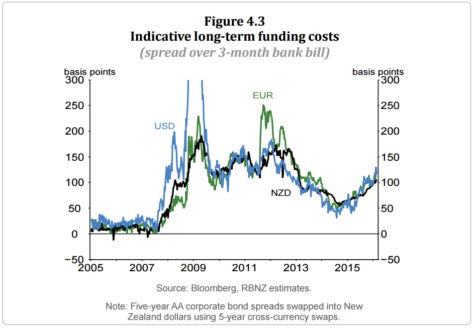 While indicators suggest short-term funding has become modestly cheaper for New Zealand banks in 2016, the cost of funding through longer-term wholesale borrowing has risen with the pick-up in financial market volatility (figure 4.3). The increase in longer-term wholesale costs this year adds to the increasing trend since mid-2014, which reflects a mix of global regulatory changes, concerns about commodity markets and emerging economies, and broader financial sector risks. To date, strong domestic deposit growth has limited the need for New Zealand banks to borrow at these higher rates. However, acceleration in credit growth over the past year might increase banks’ reliance on higher-cost long-term wholesale funding, leading to higher New Zealand mortgage rates. Moreover, continued financial market volatility may contribute to further increases in funding costs.