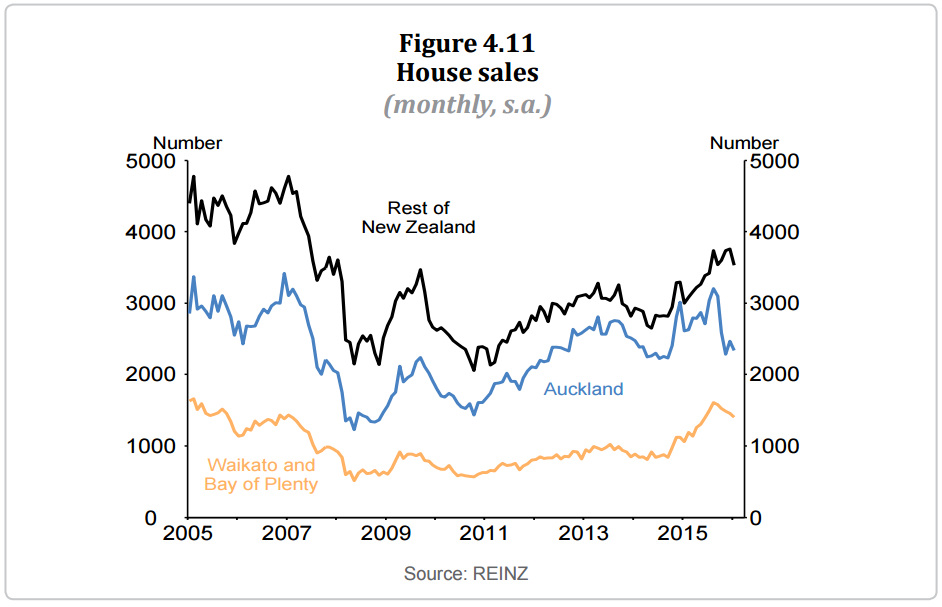 High net immigration, combined with limited housing supply in the Auckland region and low interest rates, has supported increases in house prices. House price inflation has slowed following the introduction of tax policy measures and macro-prudential policy measures applying to investor lending in the final quarter of 2015. The slowing in house price inflation has mainly been concentrated in Auckland, but has also occurred to some extent in the Waikato. House sales have fallen in Auckland and some surrounding regions, but have remained relatively stable across the rest of New Zealand (figure 4.11). It is too early to tell whether this moderation in house price inflation will be sustained.