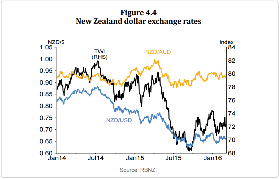 The downward momentum in the New Zealand dollar exchange rate has faded in the past six months. The New Zealand dollar trade weighted index (TWI) fell from nearly 82 in mid-2014 to a low of 68 in September 2015, but has strengthened 6 percent to around 72 (figure 4.4). The TWI currently is around 4 percent higher than forecast at the December Statement. Despite increased global risk aversion and lower world dairy prices, there has been upward pressure on the New Zealand dollar exchange rate due to an expectation that international monetary policy will be more stimulatory than previously expected.