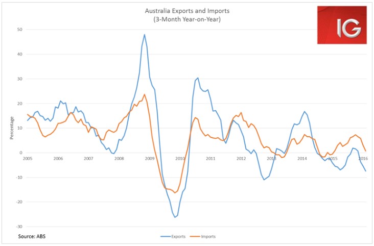 Australia’s trade balance blew out again to A$3.41 billion in February, and net exports look likely to be a drag on 1Q GDP if a similar figure is seen in March. The strength in the Aussie dollar in February and March, alongside a weak external environment, is primarily responsible for the collapse in exports.