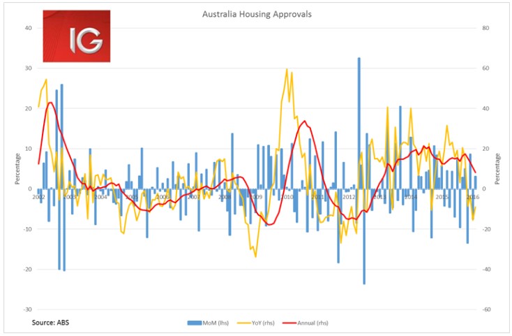 Housing approvals look to have peaked in 2015 and are steadily trending down. This is set to weigh on growth, particularly in the second half of 2016, and may eventually warrant a rate cut in 2H if new homebuilding really begins to drop off a cliff.