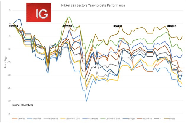 The Nikkei briefly looked like it was going to end its 7-day losing streak earlier in the session, but the further fall in the yen seems to have ended those prospects. It is a very mixed story of performance in the Nikkei, with its declines being dominated by the financial and consumer discretionary sectors, down 24.7% and 23.6% year-to-date, respectively. The telecommunications sector has comparatively outperformed, losing 5% year-to-date.